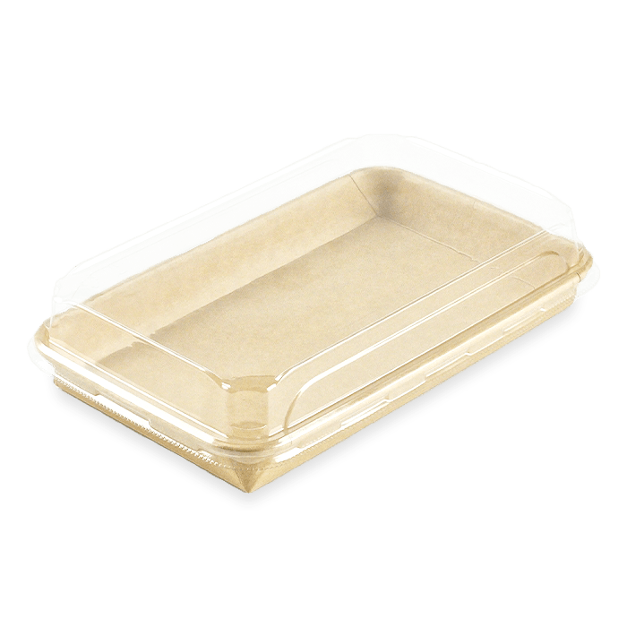 Une gamme de barquettes originales et écologiques pour la vente de Sushis. La partie contenant est en carton Kraft, avec un film PE très fin permettant de maintenir la qualité et l’humidité idéale de vos Sushis. Cet emballage est recyclable dans la filière carton, avec 90 % de matière plastique en moins par rapport aux barquettes traditionnelles. Le rebord arrondi permet un parfait clipsage du couvercle transparent en PET.
