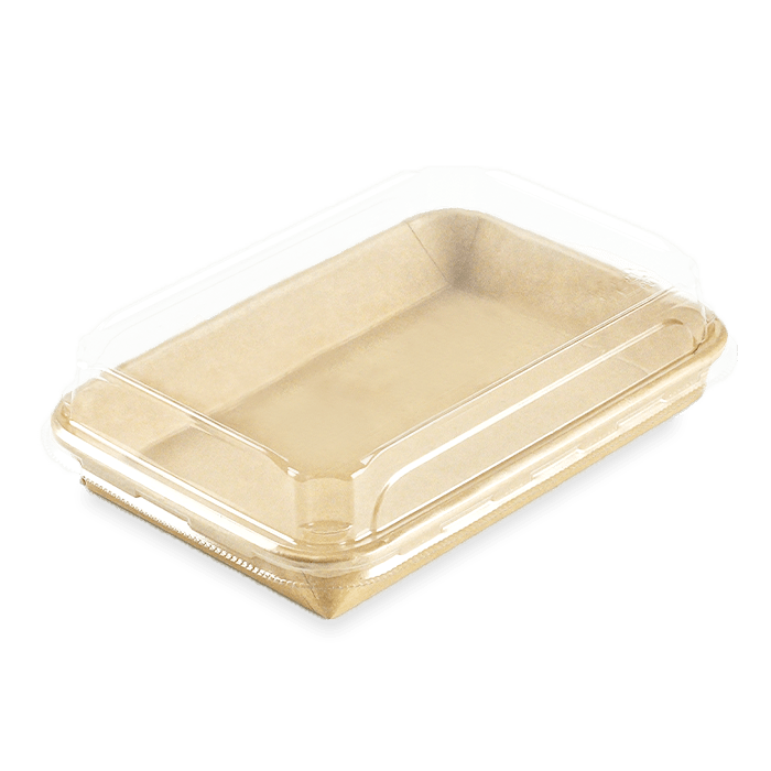 Une gamme de barquettes originales et écologiques pour la vente de Sushis. La partie contenant est en carton Kraft, avec un film PE très fin permettant de maintenir la qualité et l’humidité idéale de vos Sushis. Cet emballage est recyclable dans la filière carton, avec 90 % de matière plastique en moins par rapport aux barquettes traditionnelles. Le rebord arrondi permet un parfait clipsage du couvercle transparent en PET.