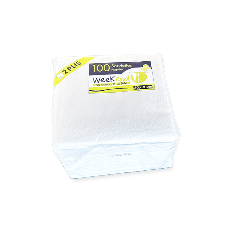 Serviettes blanches de 30×30 cm, 2 plis, parfaites pour une présentation soignée et un usage confortable. Conditionnées par paquets de 100 unités et vendues en cartons de 4800 serviettes, elles allient praticité et qualité.
